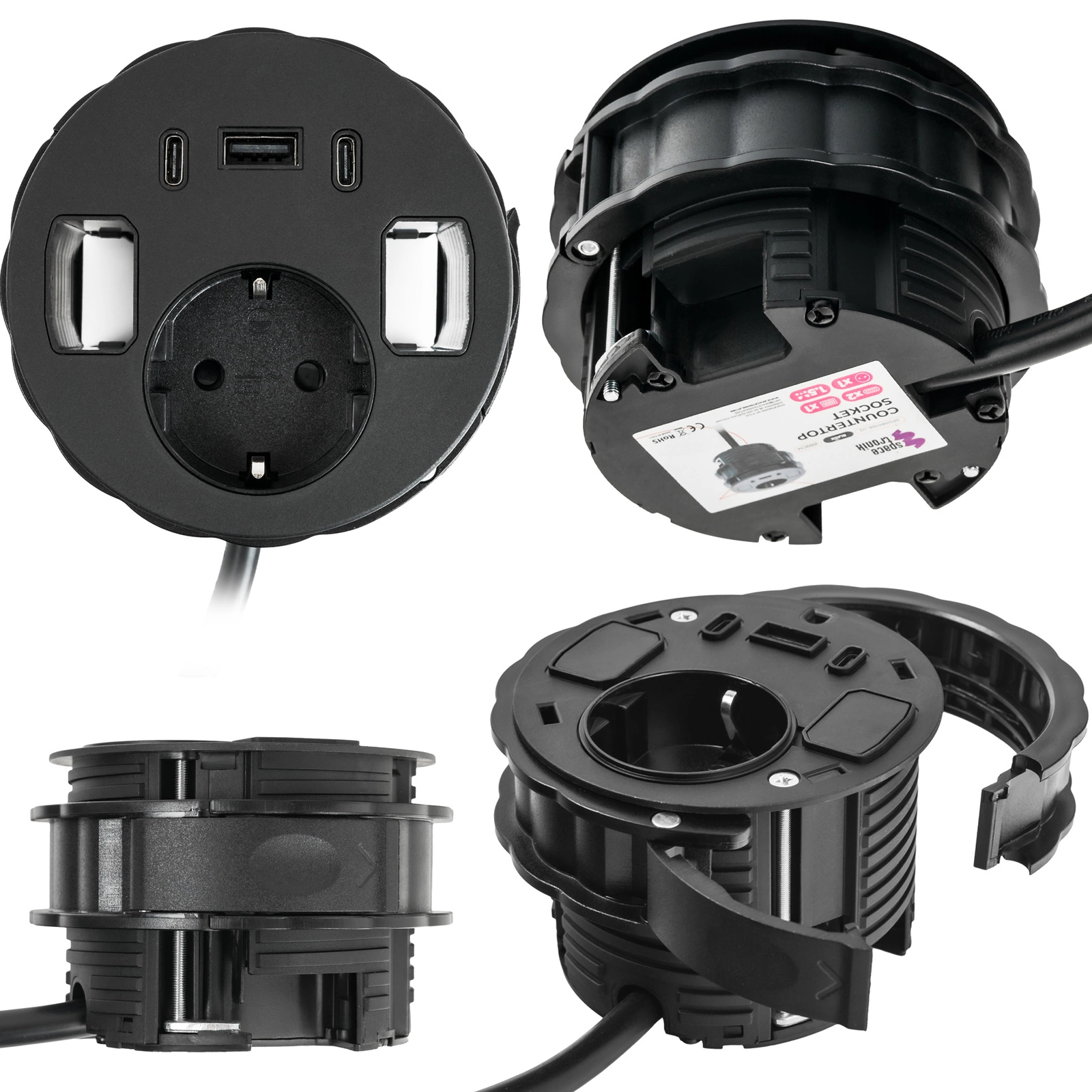 • Postaw na wygodę i porządek. Okrągłe gniazdo blatowe Spacetronik SPSRB41BB V2 1x Schuko 230 V 50 Hz i potrójna ładowarka 1x USB A 2x USB C. Przewód 1 5 m z uziemieniem. Montaż w blacie 1 do 6 cm. Wymiary 90 x 64 5 x 79 mm