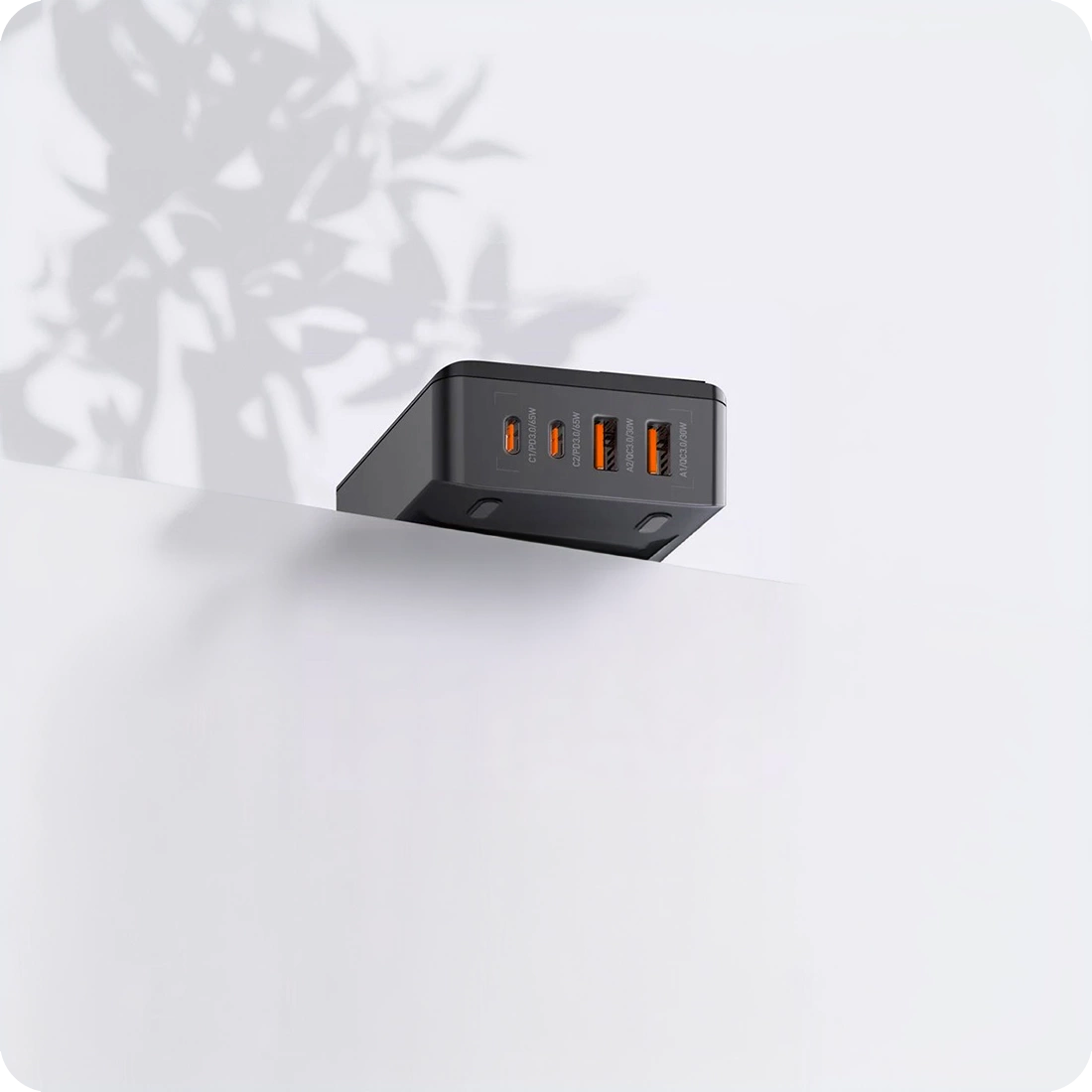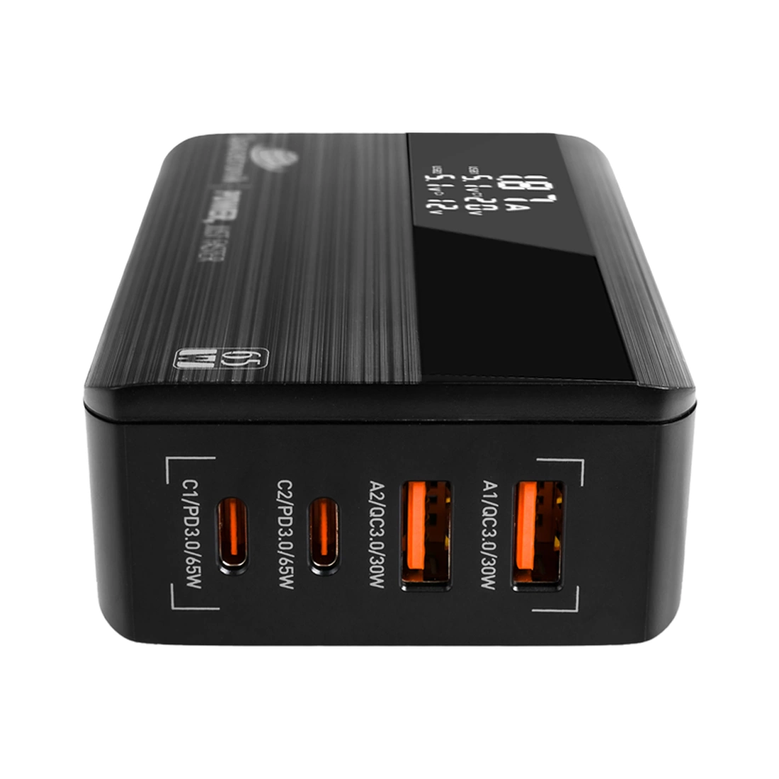 • Ładowarka 4 portowa z obsługą Power Delivery i QC3.0 2x USB-A i 2x USB-C. Moc 65W, maksymalne natężenie prądu 5A. Wbudowany wyświetlacz LED pokazujacy aktualne użycie prądu.