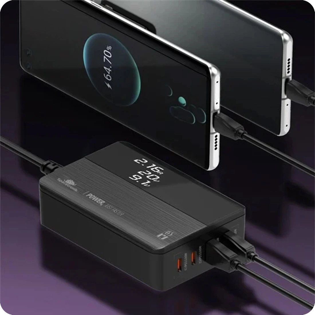 W aktualnych czasach telefony komórkowe towarzyszą nam niemal wszędzie. Jednak będą one spełniały swoją funkcję tylko wtedy, gdy będą naładowane. Stacja ładująca Spacetronik SR100 to urządzenie, które umożliwia szybkie i wygodne ładowanie akumulatorów w urządzeniach przenośnych. Takich jak smartfony, tablety czy też inne gadżety. Ładowarka jest wyposażona w 2 porty USB-C oraz 2 porty USB-A. Dzięki temu można je podłączyć do większości popularnych urządzeń. Jednocześnie można zasilać aż 4 urządzenia. Ładowarka posiada również funkcje PD i Quick Charge 3.0. Oznacza to, że - urządzenie jest w stanie szybko i efektywnie naładować akumulatory o dużej pojemności. Sama ładowarka jest zasilana kablem o długości 150 cm, co pozwala umieścić ją np. na biurku.