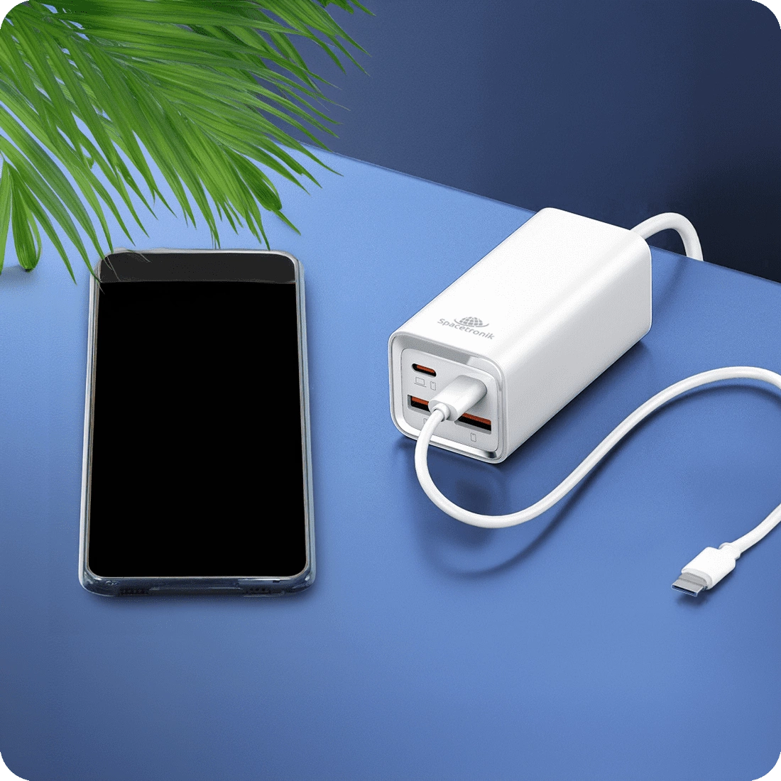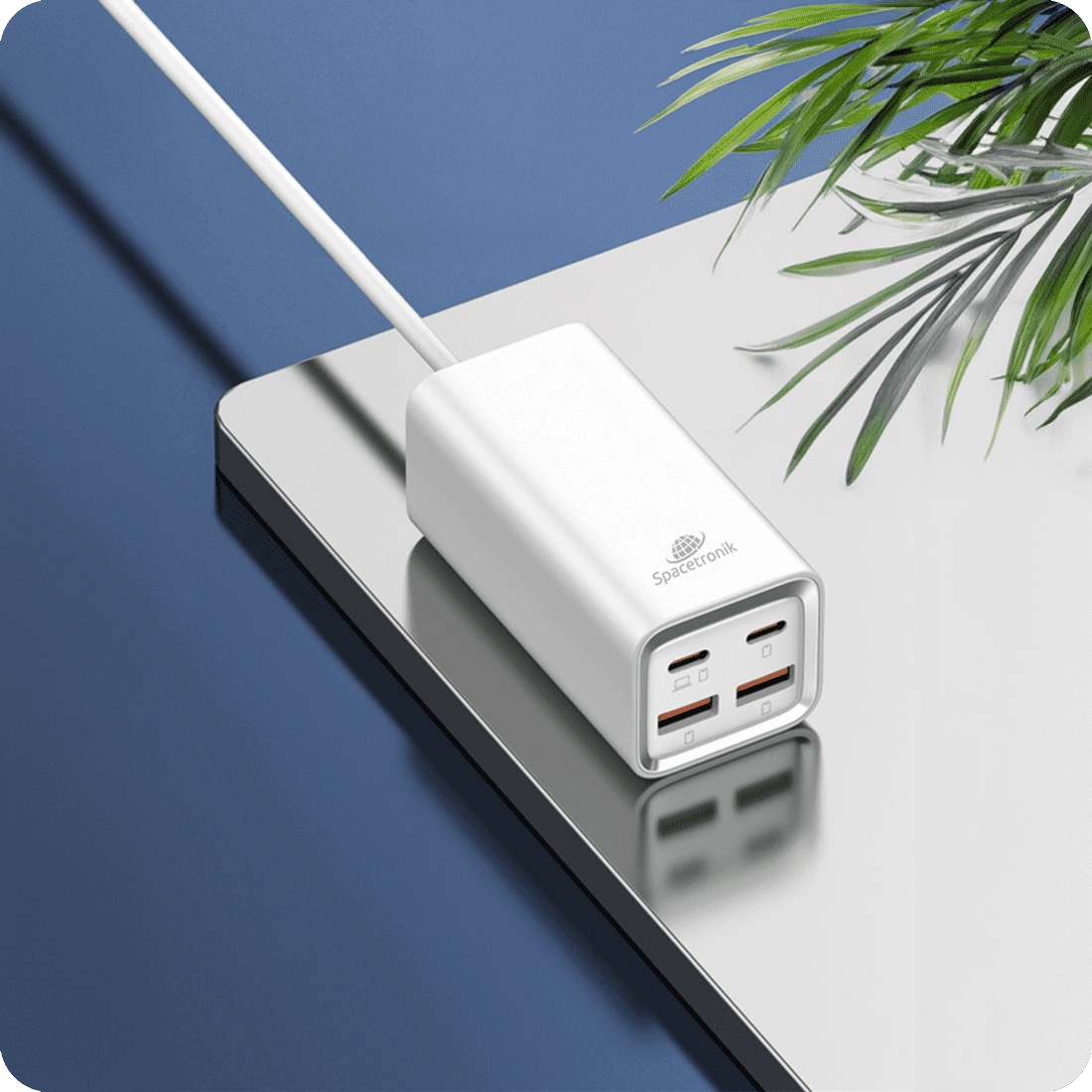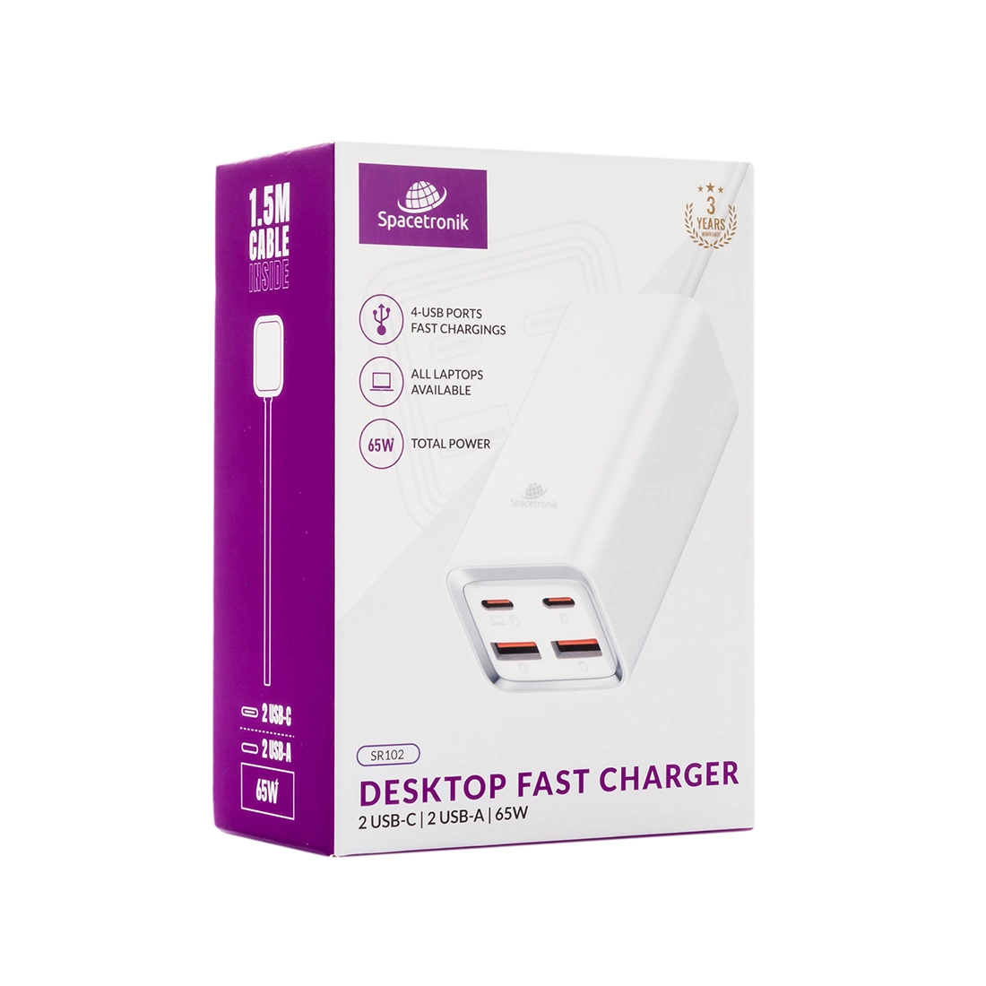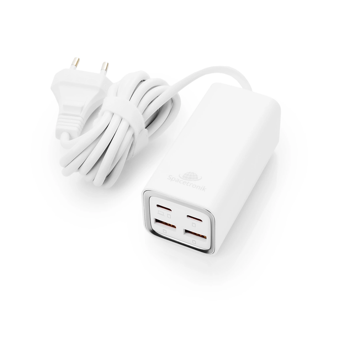 • Szybka i wielofunkcyjna ładowarka Spacetronik SR102 zapewnia Ci ładowanie o mocy 65 W na dwóch portach USB-C jednocześnie. Dodatkowo masz do dyspozycji 2 porty USB-A do 60 W. Sprawia to, że możesz jednocześnie, szybko naładować nawet do 4 urządzeń.