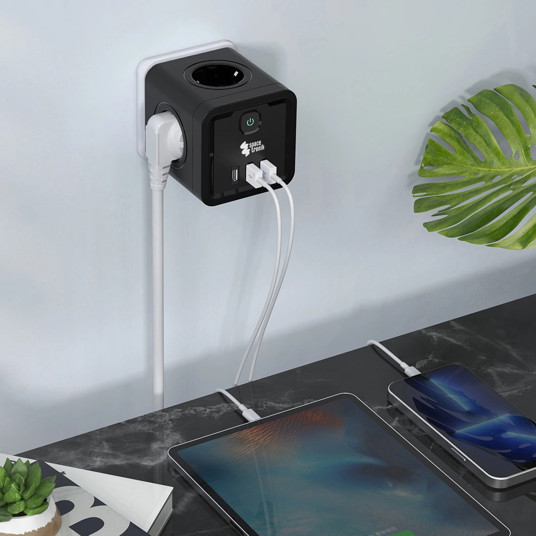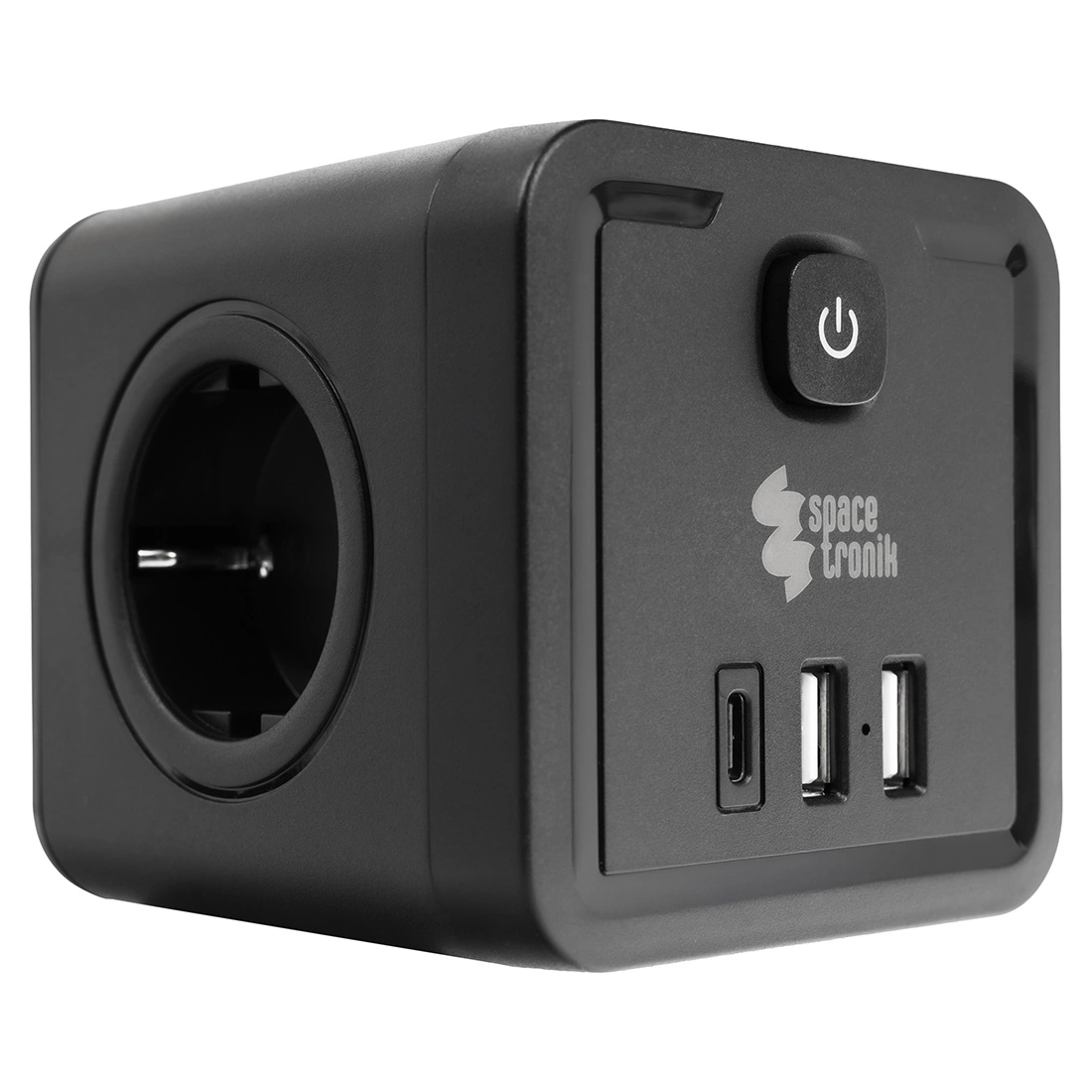 Wielofunkcyjna czarna kostka zasilająca z 4 gniazdami sieciowymi i portami USB Spacetronik SPSC03B