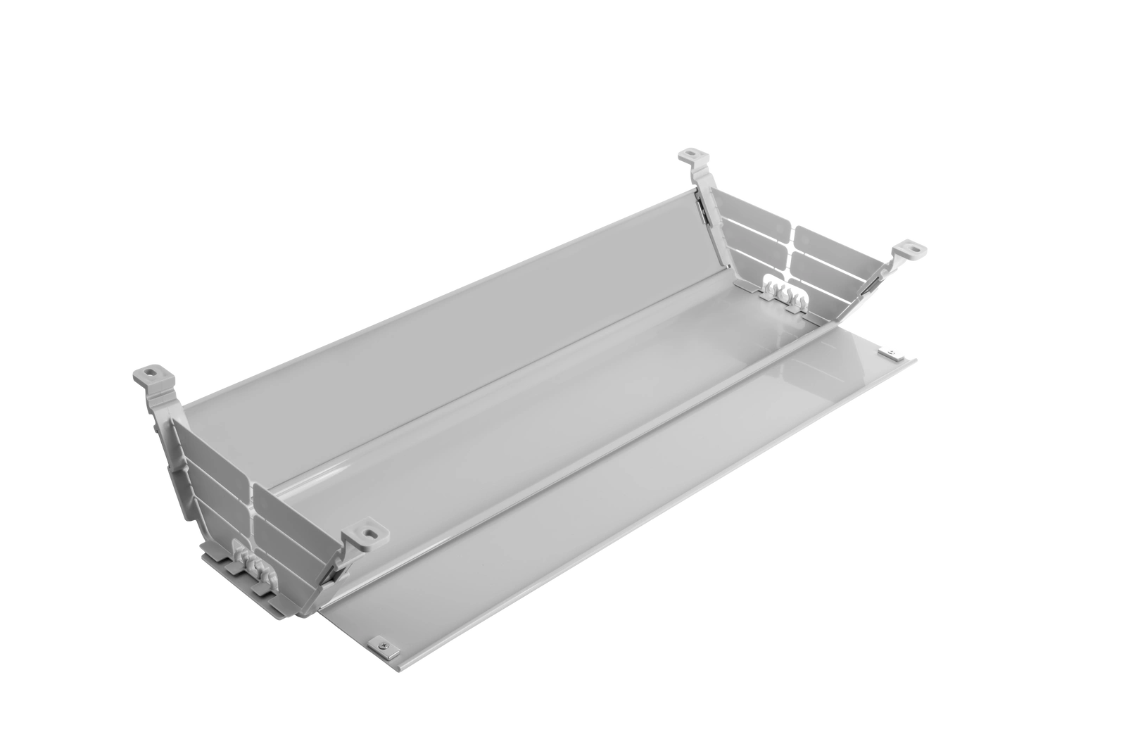 Organizer SPK-524G możesz wydłużyć, łącząc kilka segmentów w jeden długi kanał kablowy. Specjalne zakończenia z otworami montażowymi umożliwiają solidne i stabilne połączenie bez luzów i przesunięć. Rozwiązanie idealne do większych stanowisk lub biurek typu bench.