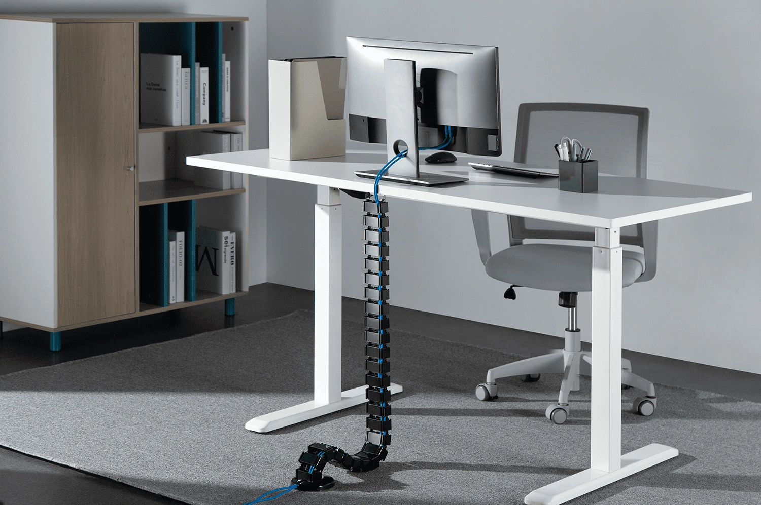 Organizer na kable SPK-180 ma możliwości zginania. Dopasujesz go do różnego rodzaju biurek. Również do biurek z regulacją wysokości. Wystarczy tylko, że przymocujesz go za pomocą śrub do blatu. Organizer sam będzie dostosowywał swoją wysokość razem z nim, zginając się lub prostując. Jest to, więc idealne rozwiązanie do stosowania razem z biurkami elektrycznymi.