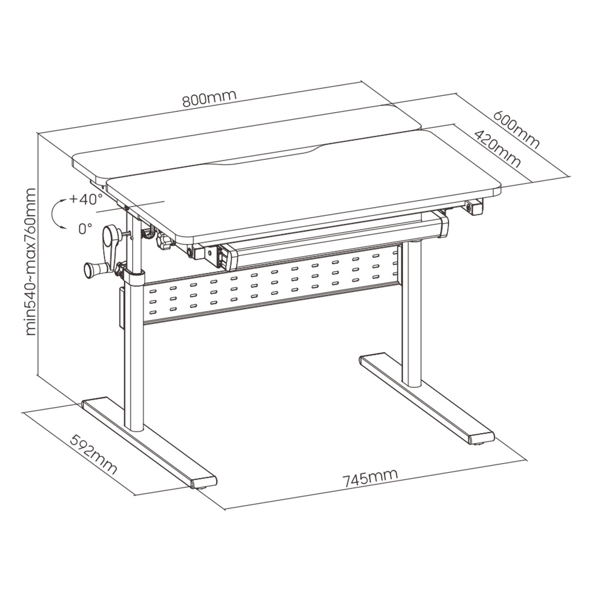 Dzieci mogą łatwo dostosować wysokość biurka do swoich potrzeb, korzystając z lekkiej i płynnej ręcznej korby, która nie jest montowana na stałe - można ją wyjąć zaraz po dosotosowaniu wysokości. Wysokość blatu jest regulowana w zakresie od 54 cm do 76 cm. W praktyce to oznacza, że użytkownikiem biurka może być zarówno sześciolatek, jak i uczeń szkoły podstawowej.