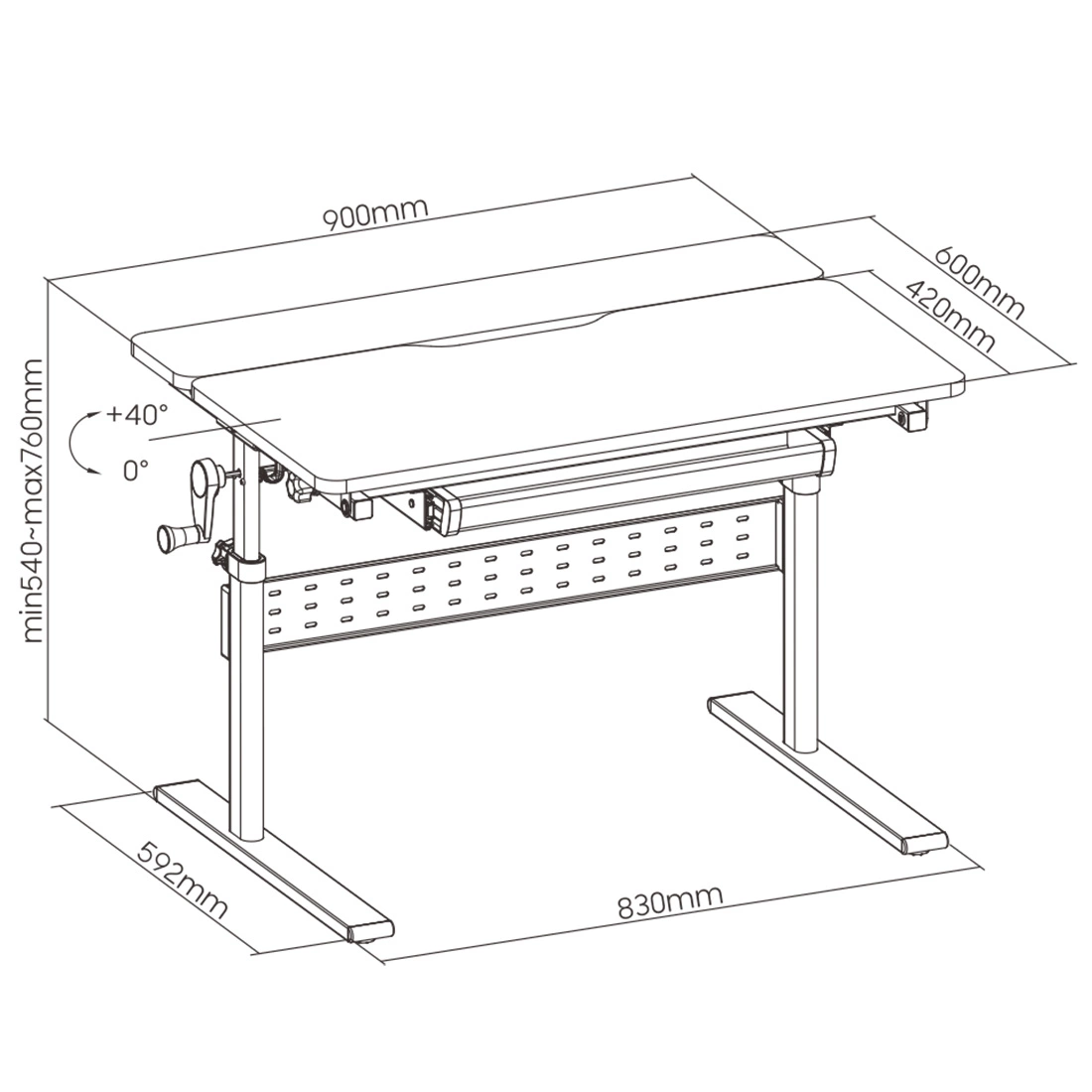 Naklápacia stolová doska v uhle 0 - 40 stupňov umožňuje dosiahnuť ergonomické uhly na čítanie, písanie a kreslenie. Vďaka tejto konštrukcii môže stôl poskytovať pohodlné pracovné polohy a pomáha predchádzať bolestiam krku a chrbta. Po nastavení sklonu utiahnite bezpečnostný gombík, aby ste si mohli byť istí, že stôl zostane v aktuálnom nastavení.