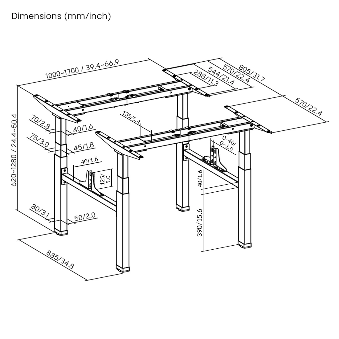 Wymiary: 1000~1700 x 1375 x 620~1280 mm (39,4"~66,9"x 54,1"x 24,4"~50,4")