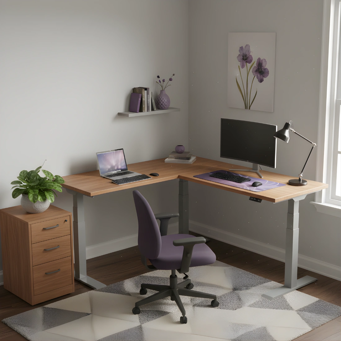 To wyjątkowy stelaż biurkowy, który pozwala dostować go odpowiednio w zależności od potrzeb użytkownika. Ustaw go w kształcie "L" (biurko narożne), "V" lub "I" (standardowe). Idealnie nadaje się do większych blatów, co pozwala uzyskać dużą powierzchnię roboczą.