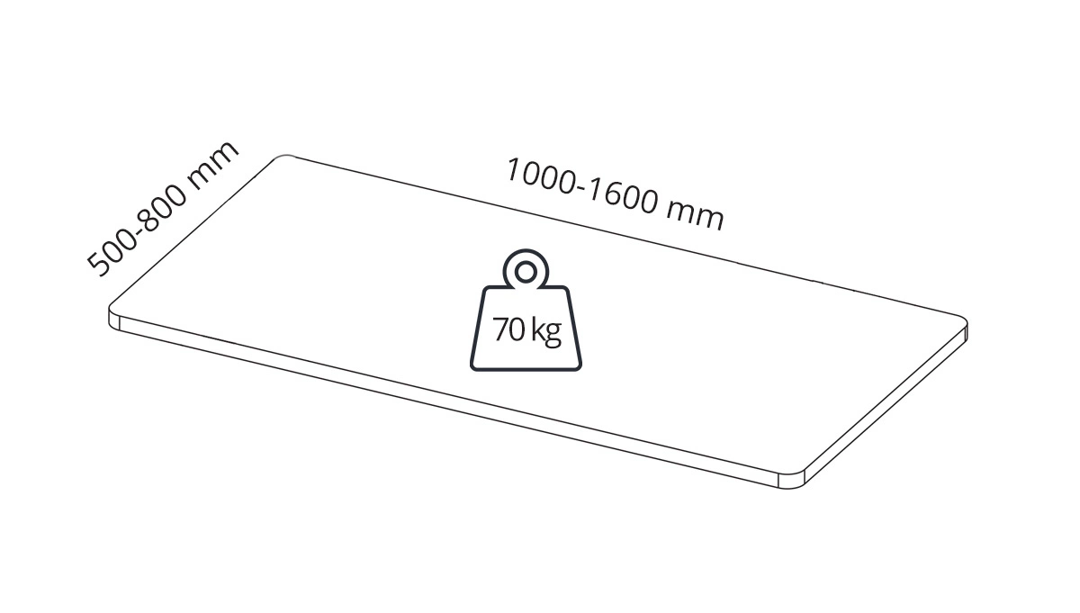 Wszechstronna rama elektrycznego stelaża oprócz regulacji góra/dół pozwala na ręczną regulację horyzontalną (w bok). W łatwy sposób rozszerzysz konstrukcję pod wymiar swojego blatu. Sugerowane wymiary blatu: 1000-1600 mm (szerokość), 500-800 mm (głębokość).