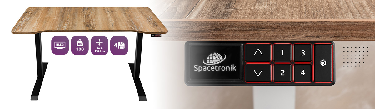 Stelaż elektrycznie regulowany Spacetronik SPE-221OA został wyposażony w kontroler z udogodnieniami. Dokonuj zmian, zapisuj ustawienia na czytelnym wyświetlaczu OLED. Reguluj wysokość za pomocą przycisków "góra" oraz "dół" i obserwuj aktualną pozycję na ekranie OLED. Zapisz do czterech wybranych ustawień wysokości i wracaj do nich w przyszłości. Biurko umożliwia blokadę kontrolera np. przed niepożądanym użyciem przez dzieci. Przestrzeń wokół przycisków jest podświetlania kilkoma kolorami naprzemiennie.