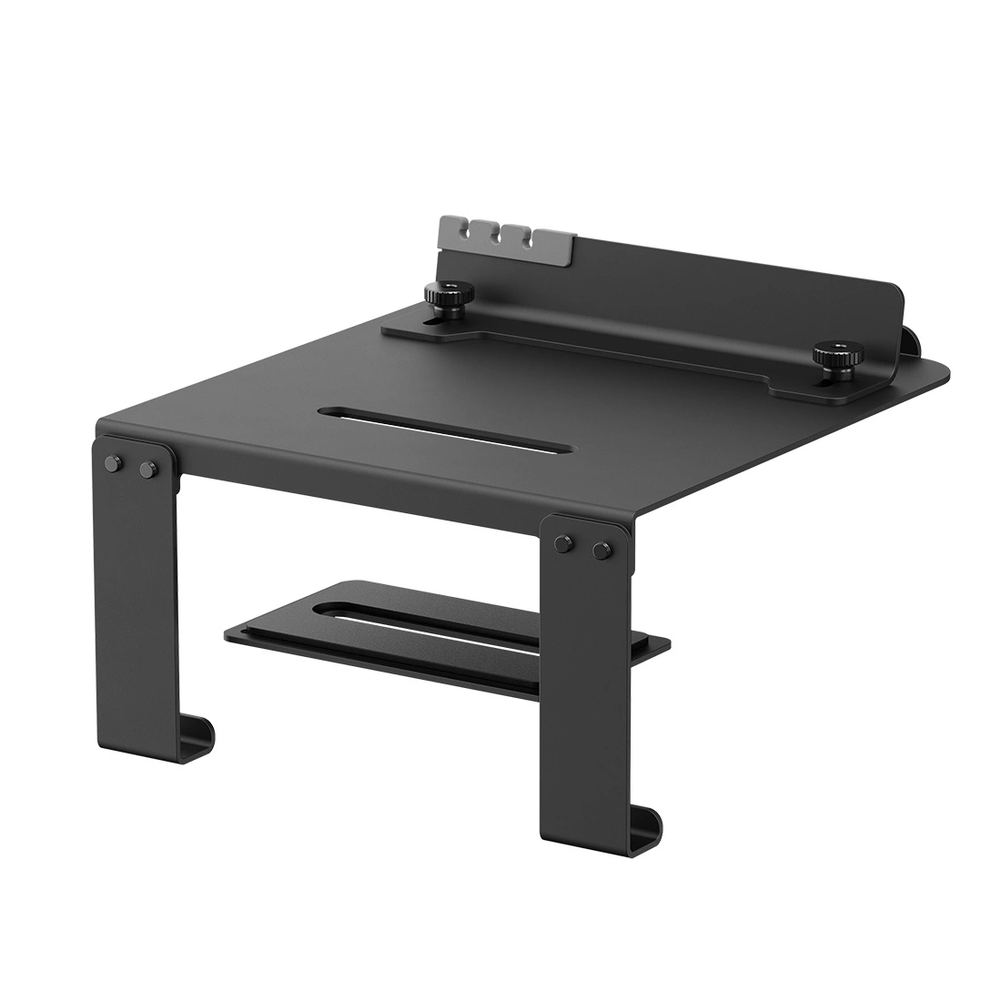 W przedniej części podstawki umieszczono praktyczny uchwyt na smartfon. To sprytne i wygodne rozwiązanie pozwala na przechowywanie telefonu w zasięgu wzroku, bez konieczności zajmowania dodatkowego miejsca na biurku. Wbudowany uchwyt na telefon zwiększa funkcjonalność podstawki i porządkuje przestrzeń pracy.