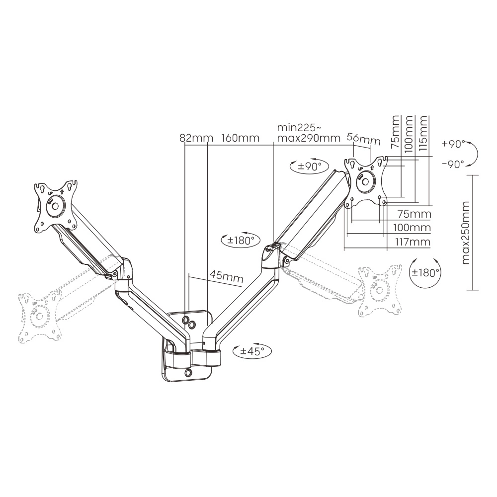 Nástenný držiak na dva monitory Spacetronik pozostáva z robustnej kombinácie ocele, hliníka a vysokokvalitného plastu, čo zaručuje spoľahlivú stabilitu. Vďaka pružinovému mechanizmu na dokonalé vyváženie hmotnosti obrazovky podporuje monitory s hmotnosťou od 2 do 9 kg a uhlopriečkami od 17? až 32??, čo zaručuje všestranné prispôsobenie monitora.