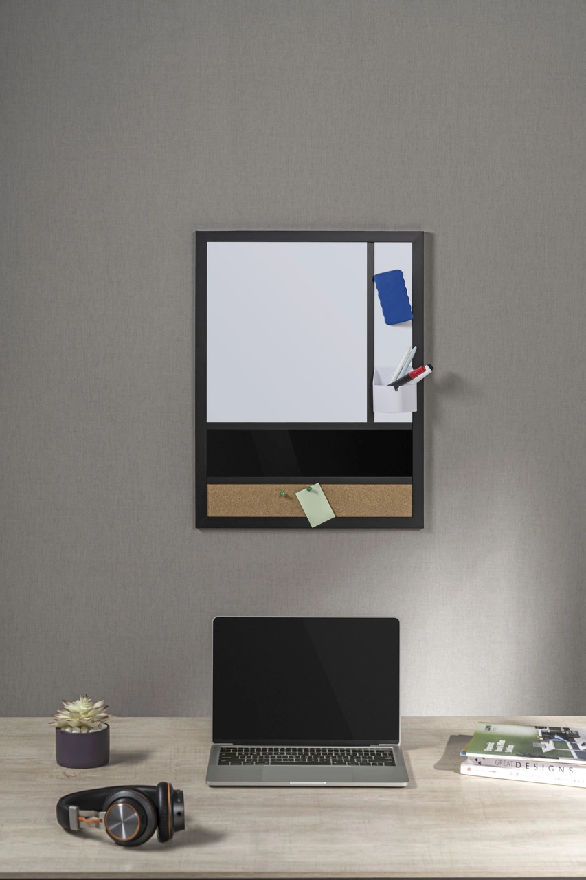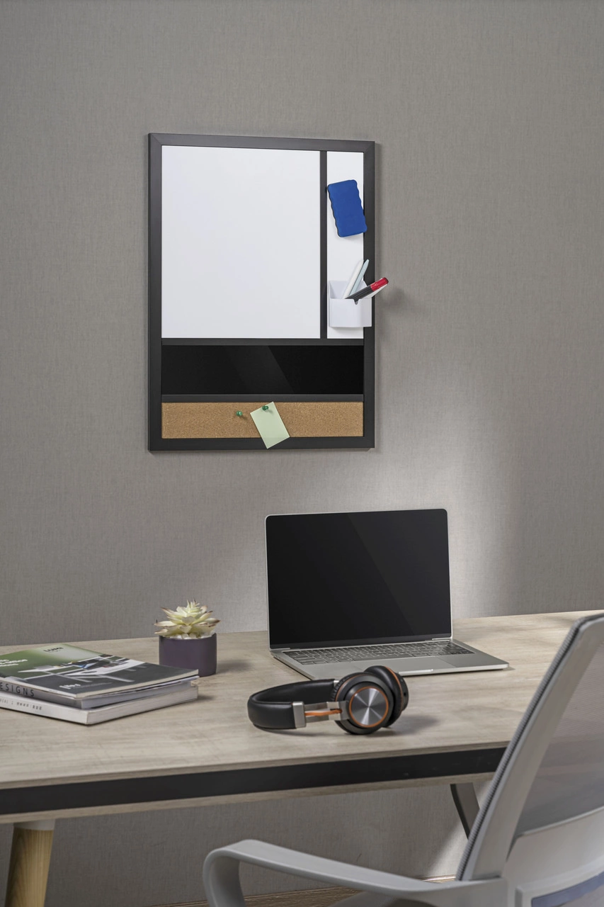 Vďaka šikovnej kombinácii funkcií suchej mazacej, korkovej a úložnej tabule sa táto tabuľa stáva komplexným organizačným nástrojom. Povrch so suchou gumou vám umožní zapisovať a vymazávať nápady na prvý pohľad, zatiaľ čo korková časť vám umožní pripínať poznámky, karty a dôležité dokumenty, čím sa ešte viac zvýši efektivita vašich každodenných úloh. Praktický úložný priestor na perá a drobnosti na tabuli vám navyše umožní mať potrebné príslušenstvo na dosah, čo sa premietne do zjednodušenia každodennej rutiny. Jedna tabuľa tak plní tri kľúčové funkcie a vytvára organizované a inšpiratívne miesto na prácu alebo štúdium.