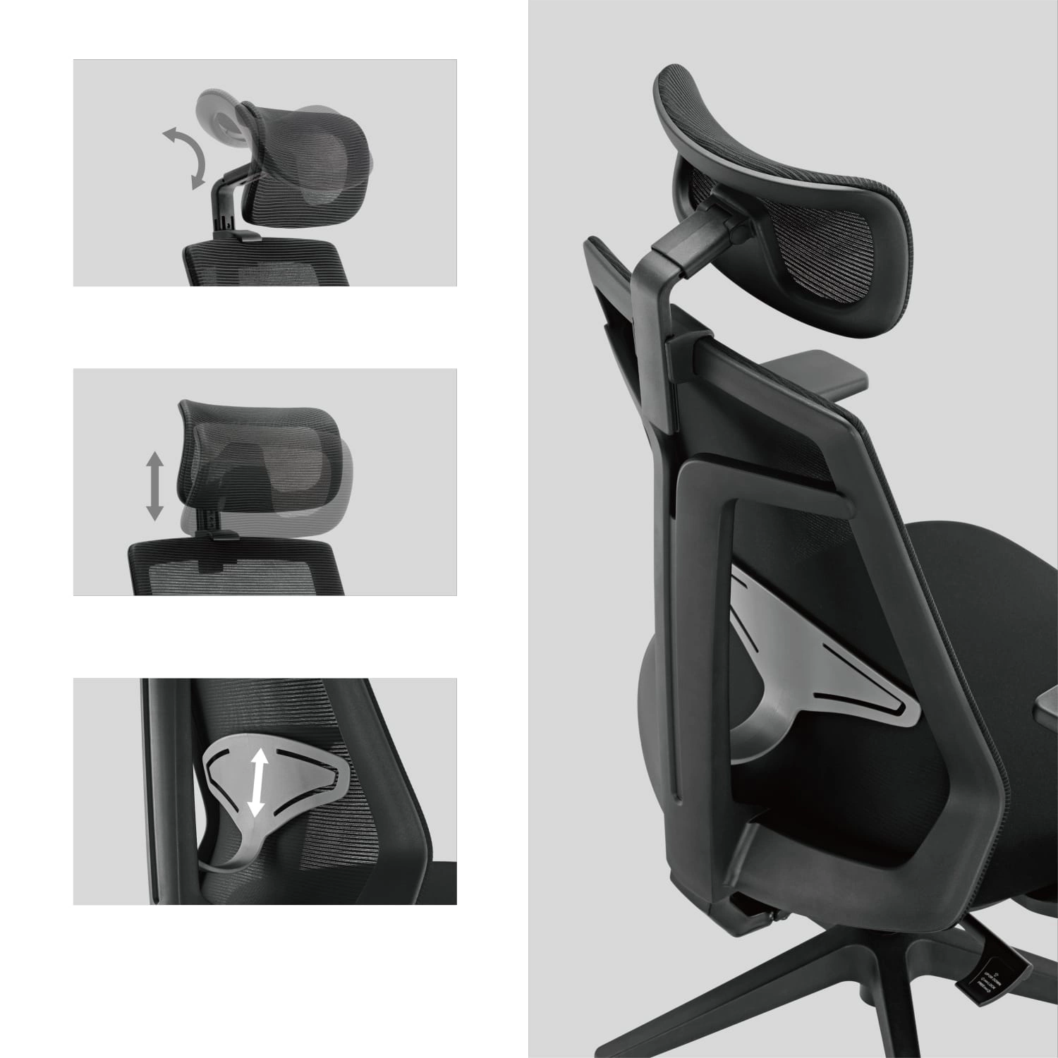 Nastaviteľná opierka hlavy kancelárskej stoličky Spacetronik GRINGO je ďalšou funkciou, ktorá zvyšuje jej použiteľnosť a pohodlie. Nastavením výšky a uhla opierky hlavy si ju používateľ môže prispôsobiť svojim ergonomickým preferenciám a potrebám. To poskytuje dodatočnú oporu pre krk a hlavu, najmä počas dlhšej práce za stolom alebo intenzívneho sústredenia na úlohu. Nastaviteľná opierka hlavy GRINGO teda nie je len komfortným prvkom, ale podporuje aj správne držanie tela a poskytuje plnú oporu chrbtici používateľa.
