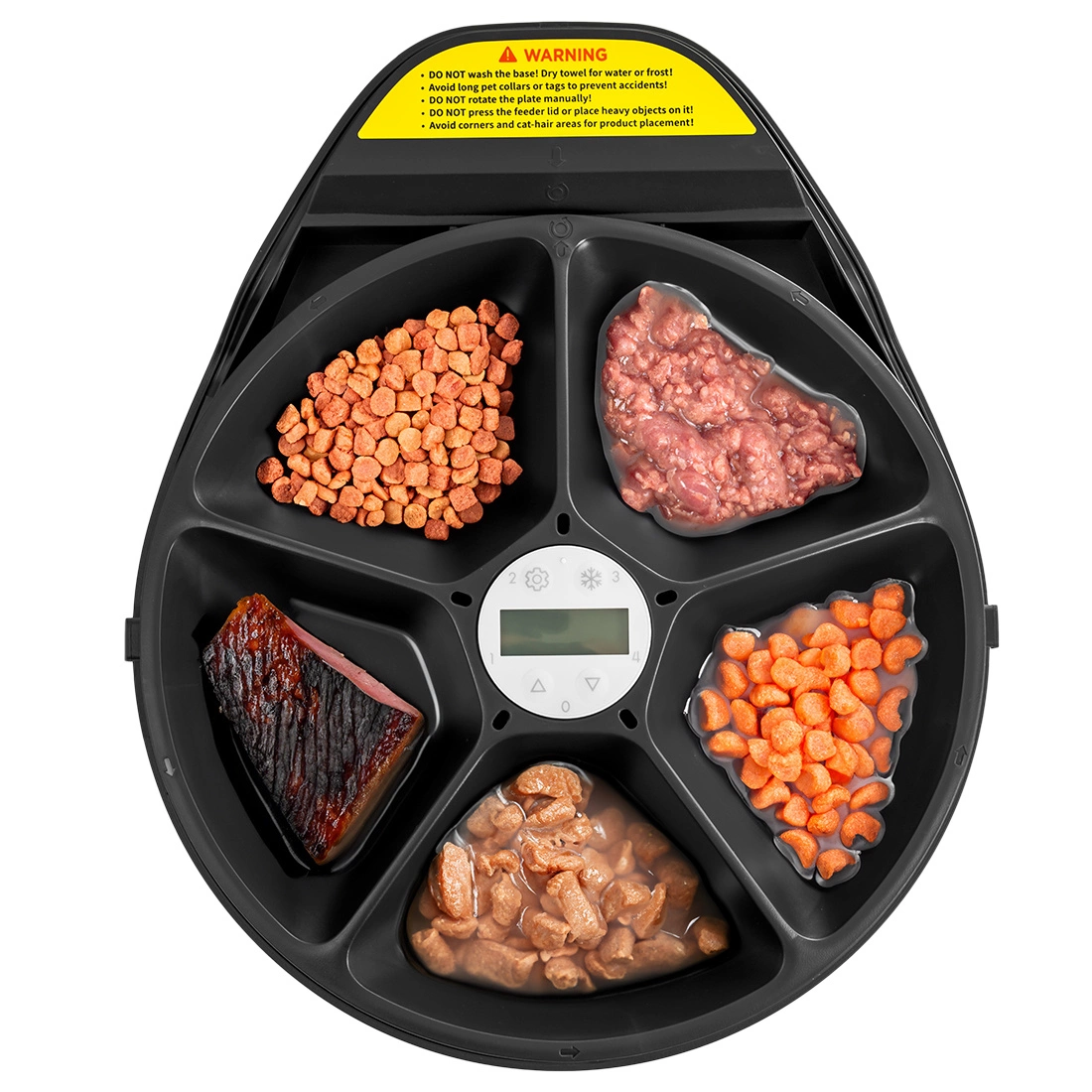 - Automatyczne karmienie: Do 5 posiłków dziennie z osobnymi komorami o pojemności 330 ml każda.