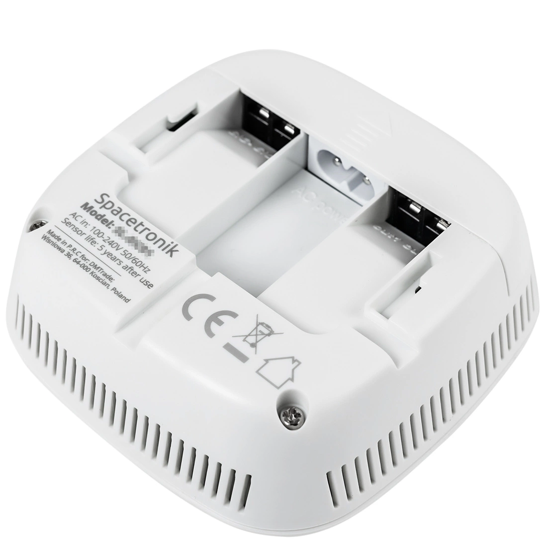 Detektor zasilany jest z gniazdka prądowego. Monitorowanie stanu, sygnału WiFi oraz ostrzeżeń odbywa się z poziomu aplikacji na urządzenia mobilne.