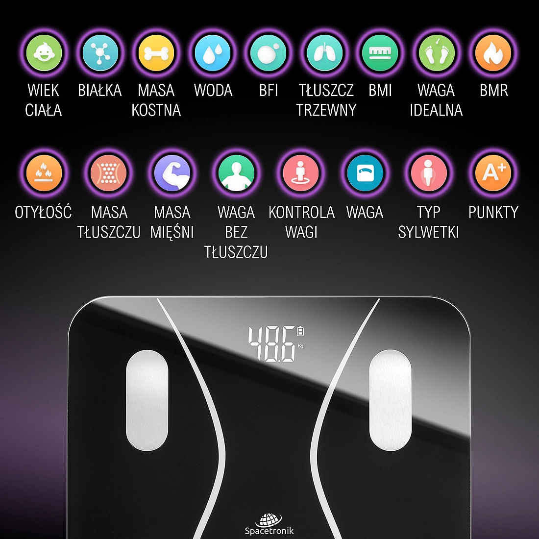 Vďaka možnosti merania viacerých telesných parametrov, ako sú hmotnosť, BMI, BMR, BFI, telesný vek, bielkoviny, kostná hmota, hydratácia, viscerálny tuk, ideálna hmotnosť, úroveň obezity, tuková hmota, svalová hmota, beztuková telesná hmota, telesný typ, body, kontrola hmotnosti, môžete presne sledovať svoj pokrok smerom k cieľu. Všetky parametre sú popísané v poľštine.