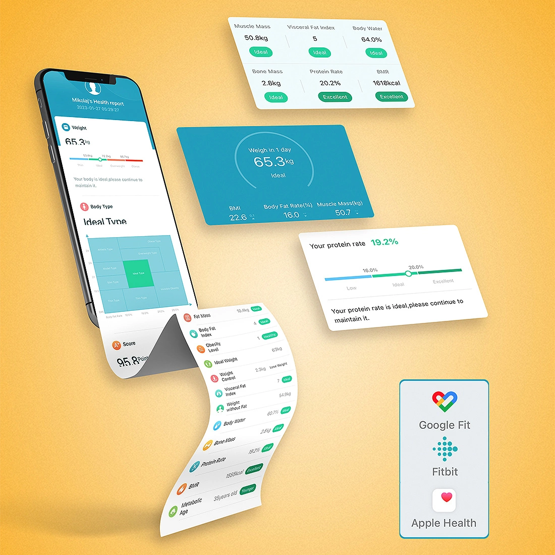Inteligentná kúpeľňová váha Spacetronik je kompatibilná s obľúbenými zdravotnými aplikáciami, ako sú Google Fit, Apple Health a Fitbit, vďaka čomu môžete jednoducho sledovať svoje pokroky a získať kompletný obraz o svojom zdraví. Všetky údaje sa automaticky synchronizujú a vy môžete používať svoje obľúbené aplikácie pre zdravie a fitnes.