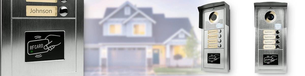 • Dverová stanica so štyrmi účastníkmi so zabudovanou bezkontaktnou čítačkou RFiD. Objektív 1,0 MP 3,6 mm, nastaviteľný hore/dole, zorný uhol objektívu 170° Montáž pod omietku