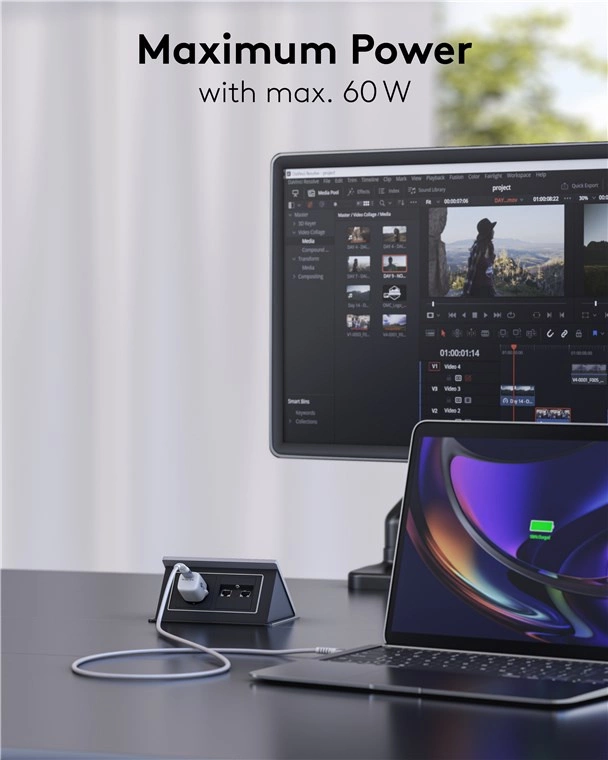 Silna ochrona z pełną mocą. Dzięki wysoce elastycznej silikonowej i tekstylnej osłonie kabel USB-C może wytrzymać wszystkie rygory codziennego życia i podróży. Przerwanie kabla i brak zasilania to już przeszłość dzięki możliwości ładowania o mocy do 60 W.