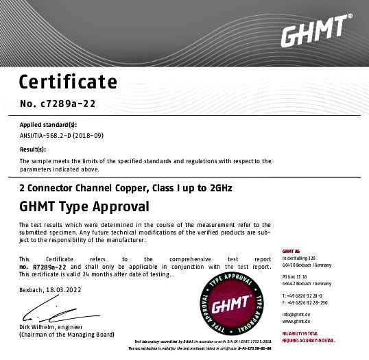 Niezawodne działanie kabla sieciowego w kanałach CAT 8.1 jest potwierdzone i udokumentowane certyfikatem GHMT. Charakterystyka transmisji kabla została przetestowana w 2-Connector Channel na dystansie transmisji 24 m pod kątem zgodności ze specyfikacją dla klasy I do 2 GHz zgodnie z ANSI/TIA-568.2-D.
