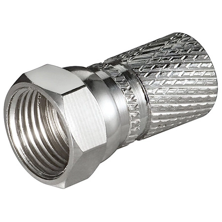 Wysokiej jakości wtyk F niklowany o dużej nakrętce, nakręcany na przewód koncentryczny 7,3mm długość wtyku 20mm.