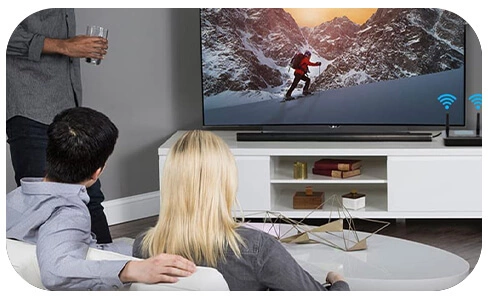 B03+ umożliwia jednoczesne słuchanie z bezprzewodowych słuchawek i przewodowych głośników / soundbara. Pozwala to użytkownikowi słuchawek na słuchanie z różnym poziomem głośności podczas oglądania telewizji z rodziną. UWAGA: Ta funkcja działa tylko z tym samym typem wejścia/wyjścia. tj. jeśli wejście jest AUX, wyjście również musi być AUX
