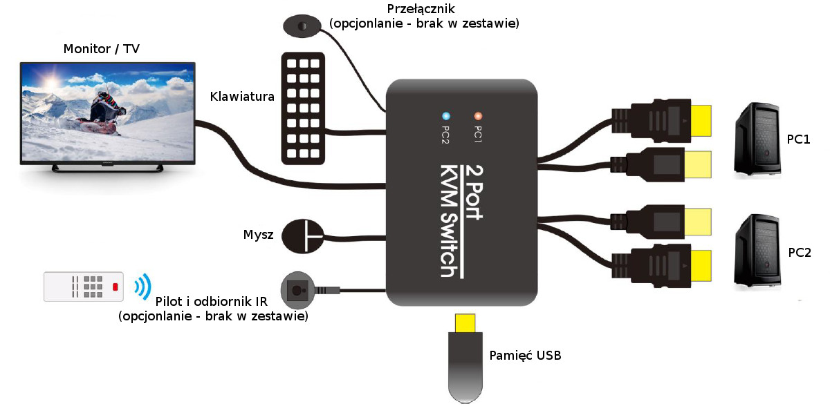 - Przytrzymaj * i naciśnij 1- wybór PC1, przytrzymaj * i naciśnij 2 - wybór PC2,