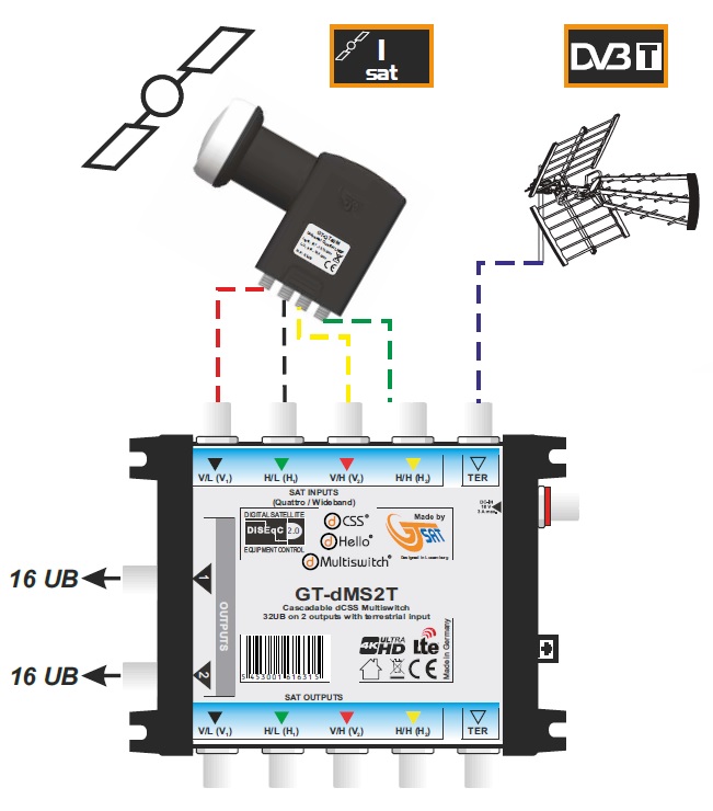 Programowalny multiswitch firmy GT-SAT model GT-dMS1TWBT działa w nowej technologi Wilde Band. Technologia do obsługi multiswitcha wykorzystuje dwa przewody poprowadzone z specjalnych konwerterów Wide Band. Multiswitch umożliwia rozbudowę instalacji w systemie Wide Band o kolejne dodatkowe 24 kanały pracy. Idealne rozwiązanie kiedy mam zainstalowany LNB typu Wide Band na antenie satelitarnej i doprowadzony sygnał bez pośrednio do odbiornika a chcemy  instalację rozszerzyć o kolejne np. odbiorniki multiroom. Wówczas tylko wpinamy tylko multiswitch pomiędzy LNB Wide Band a odbiornik. GT-dMS1TWBT posiada wyjście Unicable I/II które obsługuje 24 częstotliwości pracy.