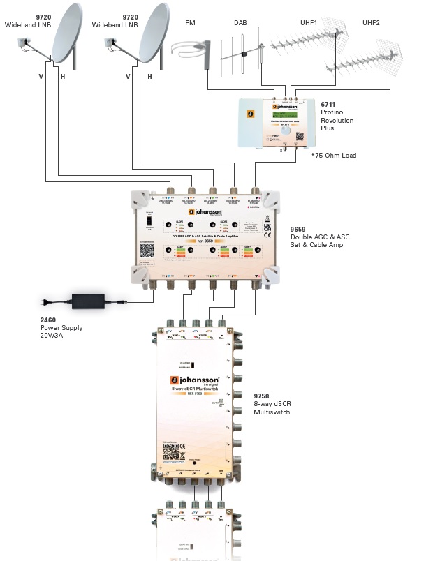 Automatická regulácia zosilnenia na všetkých linkách (V/H/kábel) a automatická regulácia sklonu na oboch satelitných linkách (V/H) - DC vstup pre zosilňovač a LNB (voliteľný napájací zdroj (ref. 9933)) - Možnosť výberu medzi širokopásmovým LNB (290 - 2400 MHz) a univerzálnym LNB (950 - 2150 MHz)Schémainštalácie:Technické špecifikácie: