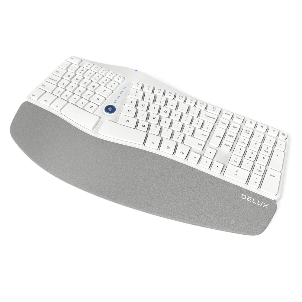 • Biela ergonomická klávesnica Delux GM901 ponúka používateľský komfort vďaka rozdelenému rozloženiu a pokročilým bezdrôtovým funkciám. Je navrhnutá s ohľadom na zdravú polohu rúk, ideálna na dlhú prácu.