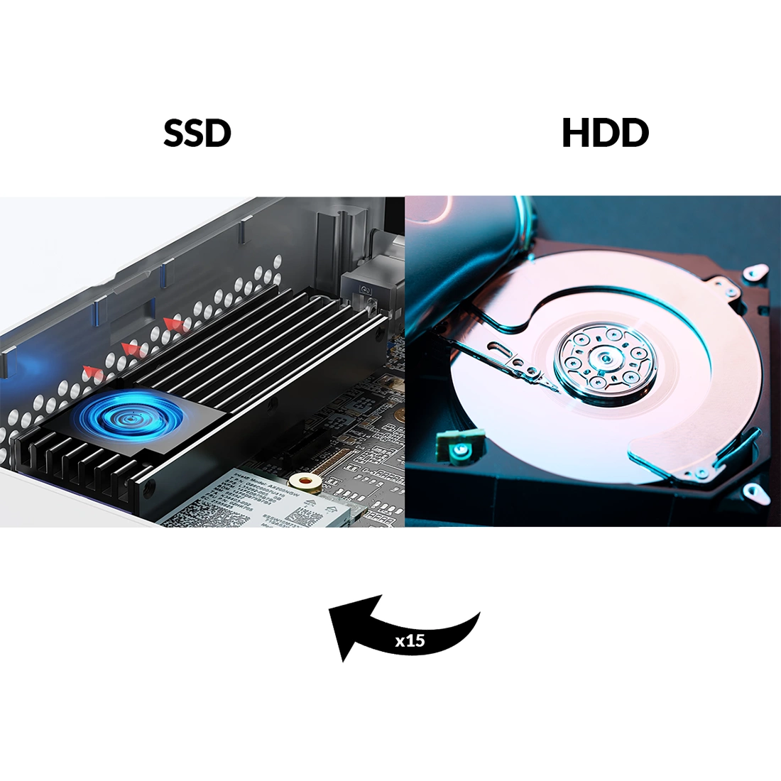 Na trhu už roky prebieha konkurencia medzi dvoma typmi diskov: SSD a HDD. Dlhý čas boli populárnejšie HDD, ale to sa teraz mení smerom k SSD. To všetko vďaka tomu, že disky SSD sú minimálne 2,5-krát rýchlejšie. Najlepšie SSD disky však môžu byť až 100-krát rýchlejšie ako tradičné HDD médiá. Navyše sú SSD disky oveľa odolnejšie voči mechanickému poškodeniu aj poškodeniu rôznymi typmi skratov. Okrem toho jeho rýchlosť nijako nezávisí od vonkajšej teploty. Mini stolný počítač Minisforum UM790 PRO má dva sloty na SSD, čo vám dáva celkovú kapacitu 1 TB. Mini PC UM790 PRO podporuje aj konfigurácie RAID0 a RAID1.