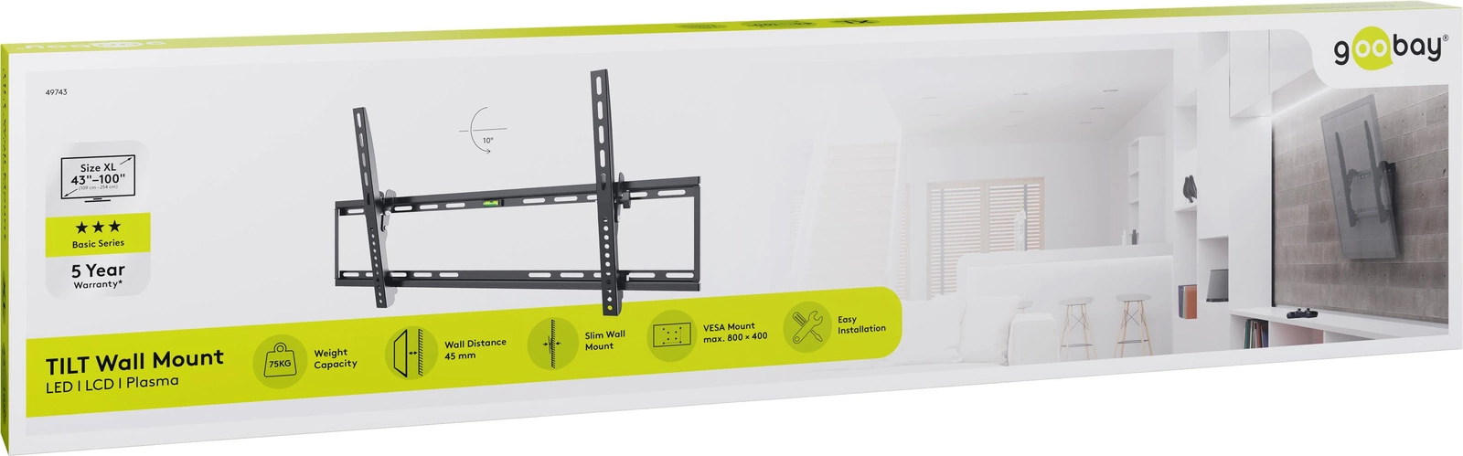 Uchwyty cechujące się solidnym wykonaniem i długoletnią gwarancją (seria BASIC 5-letnią, seria PRO 10-letnią). Zapewniają solidne mocowanie telewizora każdego typu na ścianie, idealnie dopasowują się do Twojego wystroju wnętrza. Uchwyty Goobay są regulowane w niemal każdej możliwej płaszczyźnie: pochył góra/dół, skręt lewo/prawo, odległośc od ściany. W galerii produktu umieszczamy rysunek z wymiarami uchwytu. Poniżej podajemy dokładną specyfikację techniczną.