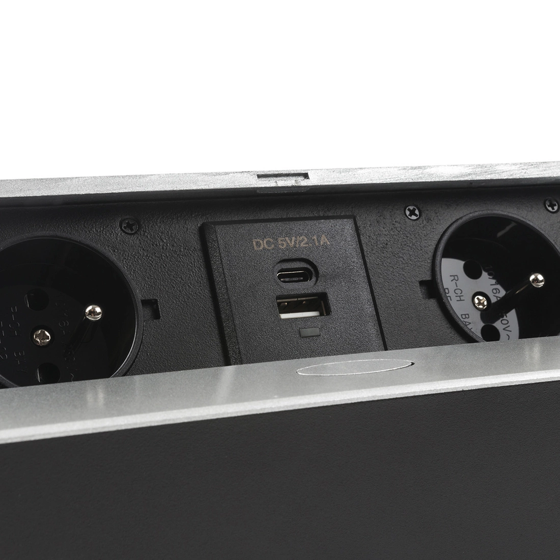 Gniazdko w blacie SPS-D24CS posiada podwójną ładowarkę USB (USB-A + USB-C), dzięki której naładujesz swój telefon, tablet i inne urządzenia.