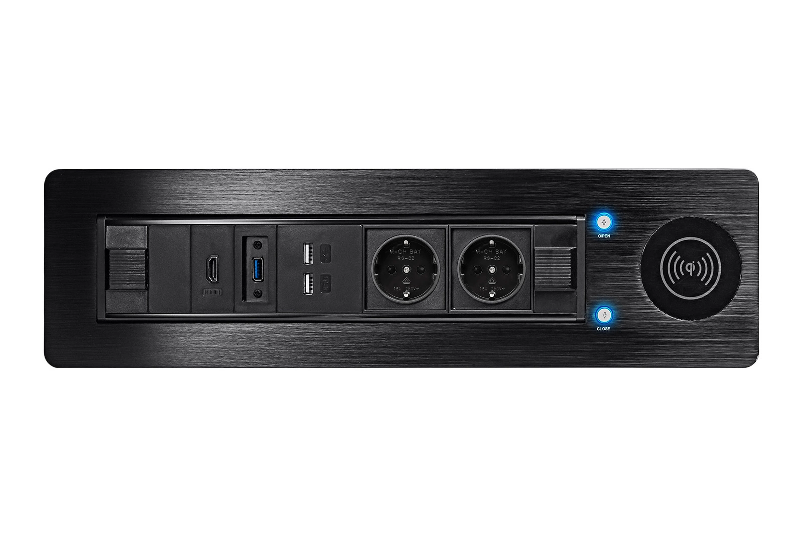 Elektryczny mediaport Spacetronik SPS-E27B V2 to nowoczesne rozwiązanie, które znajduje zastosowanie w sklepach, salonach sprzedaży, salach konferencyjnych, biurach, a także w domu. Jedno naciśnięcie przycisku spowoduje, że gniazda płynnie się odkryją. Wykonany z aluminium i wysokiej jakości komponentów. Produkt jest przeznaczony do montażu wewnątrz pomieszczeń w biurkach, blatach i stołach, zarówno w pozycji pionowej jak i poziomej, zapewniając dostęp do gniazd. Mediaport został wyposażony w 2 gniazda 110-250 V (typ Schuko), podwójną ładowarkę USB, gniazdo HDMI 2.0, USB 3.0 oraz ładowarkę indukcyjną, dzięki której bez użycia kabli naładujesz swoje urządzenie mobilne.