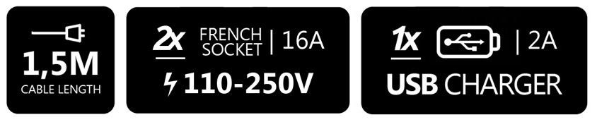 - 2x gniazdo typu francuskiego 110-250 V (16 A)- 1x podwójna ładowarka USB (2x USB-A)