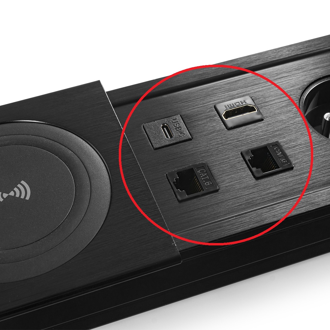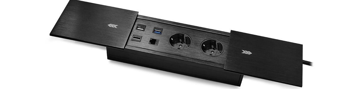Mediaport Spacetronik ERGOLINE SPS-S26B V2 to nowoczesne rozwiązanie, które znajduje zastosowanie w sklepach, salonach sprzedaży, salach konferencyjnych, biurach, a także w domu. Wykonany z aluminium i wysokiej jakości komponentów. Produkt jest przeznaczony do montażu wewnątrz pomieszczeń w biurkach, blatach i stołach, zarówno w pozycji pionowej jak i poziomej, zapewniając dostęp do gniazd. Oprócz standardowych gniazd zasilających (Schuko) posiada także porty USB 3.0, USB 2.0, HDMI oraz gniazdo Ethernet RJ-45, a wszystko to przykrywają dwie zasuwane aluminiowe pokrywy.