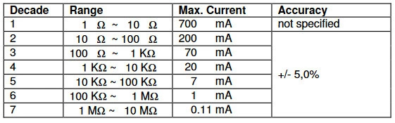 100 k? ~ 1 M?; 1 mA 1 ~ 10 M?; 0,11 mA