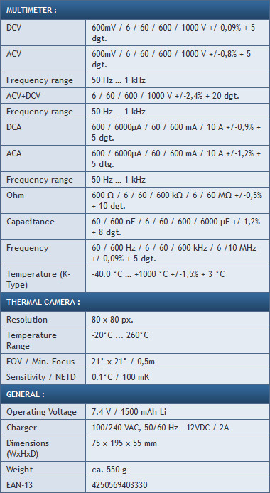 Zintegrowana kamera termowizyjna zapewnia bardzo szybką częstotliwość odświeżania 50 Hz dla płynnego wyświetlania podczas rozwiązywania problemów i wykorzystuje rozdzielczość termiczną 80 x 80 pikseli. Możesz użyć menu graficznego, aby przełączać się pomiędzy różnymi paletami kolorów (Szary i Zaangażowany / Żelazo / Tęcza itp.), Ustawić współczynnik emisji lub aktywować wskaźnik laserowy do kierowania.