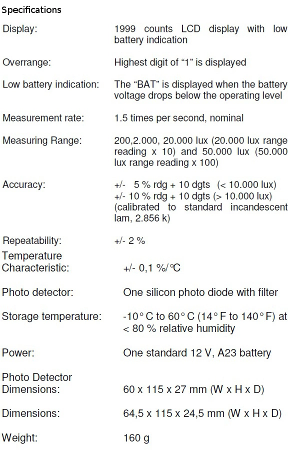 - Pomiar światła w zakresie od 0,1 luksa do 50 000 luksów