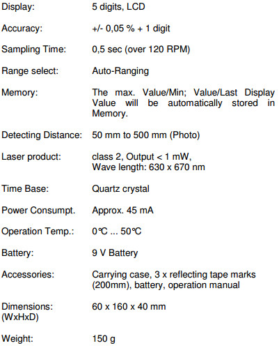 Tachometr cyfrowy z 5-cyfrowym podświetlanym wyświetlaczem LCD 13 mm. Zapewnia szybkie i dokładne, bezdotykowe pomiary prędkości obrotowej (RPM) oraz tryb zliczania łącznej liczby obrotów (REV). Funkcja lasera zapewnia szybki i dokładny pomiar prędkości wirujących obiektów z dystansu. Z wbudowanej pamięci można wywołać min/max. oraz ostatnią zapamiętaną wartość. Urządzenie posiada wbudowany akumulator, dzięki czemu mamy mozliwość pomiarów mobilnych (9V) lub pomiary stacjonarne z mozliwością podłączenia zasilacza 6V. Całość została wykonana z najwyższej klasy plastików, a zintegrowana antypoślizgowa guma zapewnia wygodne użytkowanie urządzenia i przede wszystkim zabezpiecza przed wyślizgnięciem się urządzenia z reki, co daje nam stabilne i łatwe użytkowanie urządzenia nawet w trudnych warunkach.