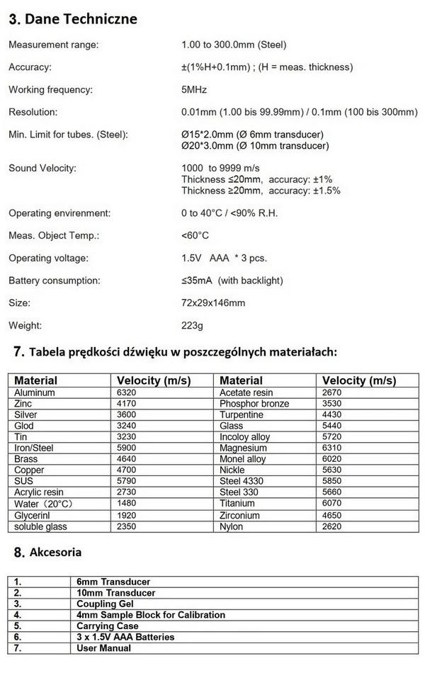 - Akcesoria: sondy 6 i 10 mm, żel kontaktowy, płytka kalibracyjna, aluminiowy futerał, baterie.