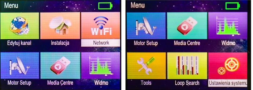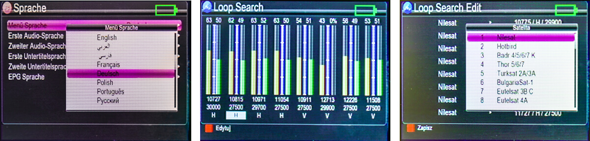 - Wybór satelity wraz z częstotliwością (transponder satelitarny) z ustawieniami portu DiSEqC. Obsługa konwerterów Unicable I z możliwością wprowadzenia do 8 parametrów SCR oraz Unicable II z możliwością wprowadzenia do 32 parametrów SCR