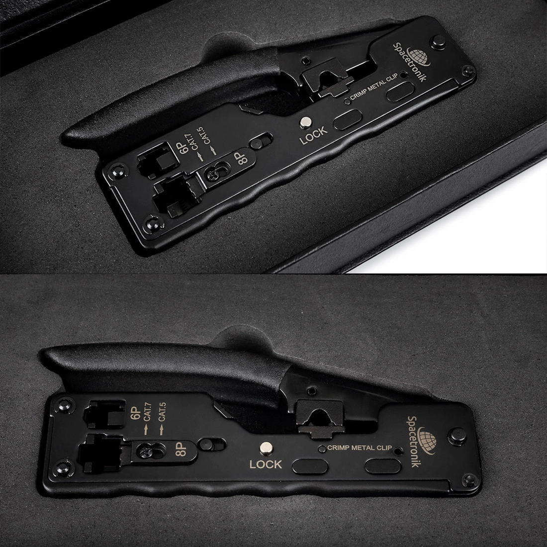 Zaciskarka Spacetronik pozwala za zarabianie wtyków RJ45, RJ12 oraz RJ11 na kablach teleinformatycznych. Wtyki są dokładnie zaciskane z uwag ina równoległe prowadzenie elementu zaciskającego i mechanizm uniemożliwiający niedokładne zaciśnięcie. Narzędzie jest dedykowane do zarabiania konektorów tzw. przelotowych, przez które żyły przewodów przechodzą na wylot i wystają, dzięki czemu sprawdzenie poprawnego ułożenia jest o wiele łatwiejsze. Po umieszczeniu takiego wtyku w komorze zaciskarka zarówno zarobi wtyk, jak i precyzyjnie przytnie wystające przewody.