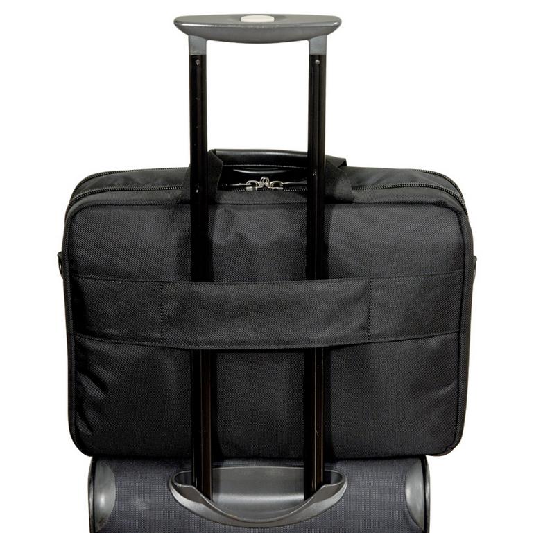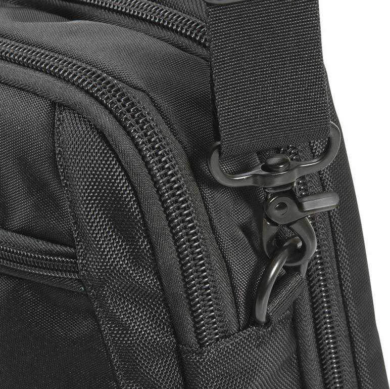 Everki Flight Briefcase pozwala bezpiecznie przewozić plecak na torbie podróżnej, specjalnie schowany pas pozwala przelozyc torbę przez uchwyt torby podróżnej.