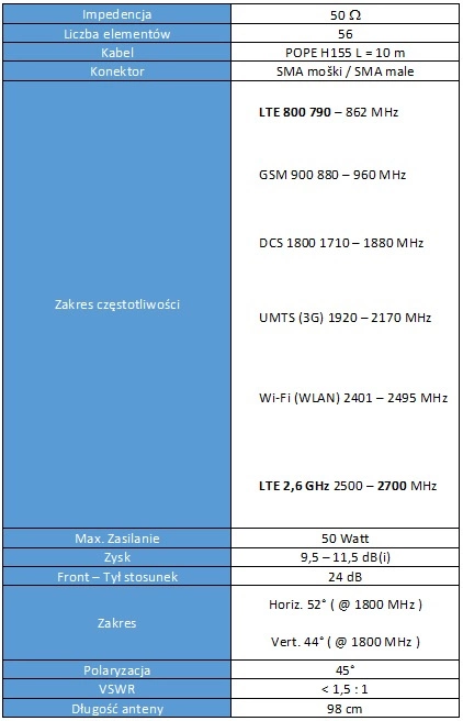 Zestaw antenowy obsługuje zakres częstotliwości od LTE 800 do LTE 2,6 GHz. Zestaw jest idealny aby podłączyć go do routera Wi-Fi lub modemu MiMo.