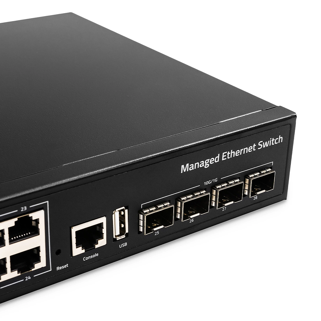 24 Gigabit ports - 4 10Gigabit SFP+ slots - Support for IEEE 802.1d, IEEE 802.1w, IEEE 802.1s, IEEE 802.1p, IEEE 802.3, IEEE 802.3u, IEEE 802.3x, IEEE 802.3z, IEEE 802.3ab, IEEE 802.