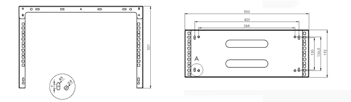 Uchwyt Rack przystosowany do montażu bezpośrednio do ściany. Zaprojektowany w standardzie 19". Ułatwia montaż urządzeń do których dostęp nie musi być zabezpieczony szafami serwerowymi. Dodatkowo na każdym uchwycie są otwory od góry i dołu w standardzie 19" do zamocowania dodatkowych mniejszych urządzeń.