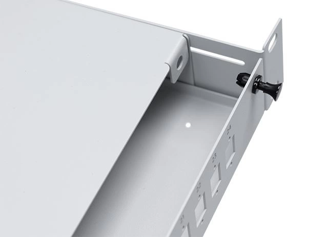 Dedykowane zapinki z obu stron przedniej części przełącznicy, zabezpieczają szufladę przed niekontrolowanym otwarciem. W szufladzie na stałe został zamontowany kołek gwintowany M5 z nakrętką radełkowaną do montażu tacki na spawy. Regulowane, samodzielnie montowane przedłużki z otworami w standardzie RACK, umożliwiają montaż przełącznicy do przednich wsporników w szafach telekomunikacyjnych.