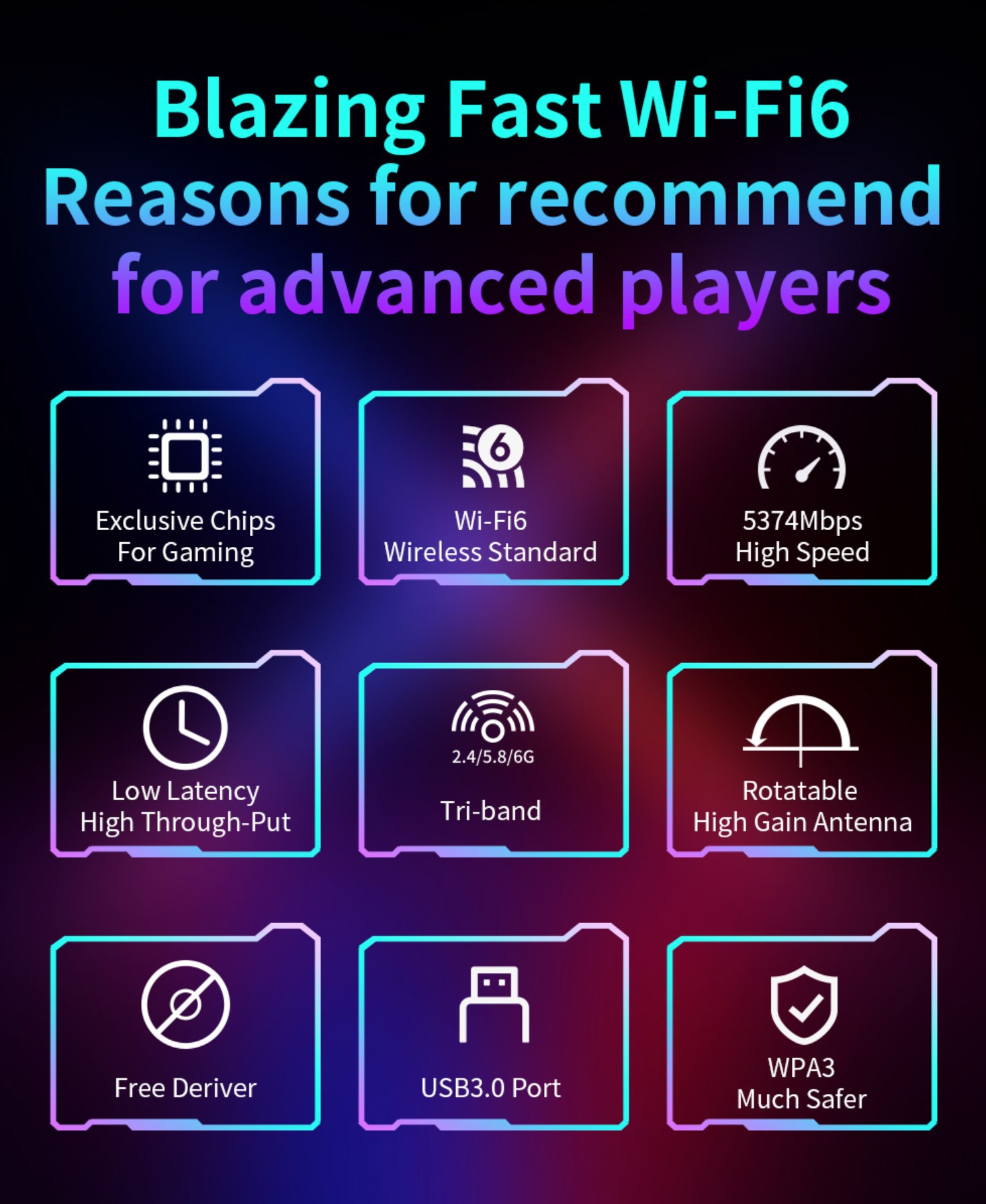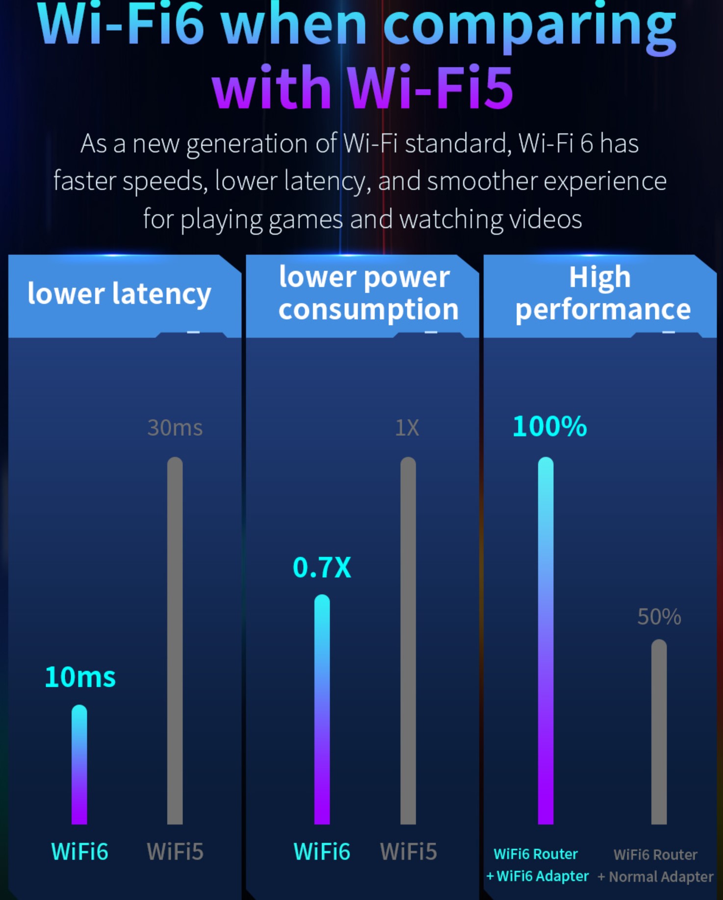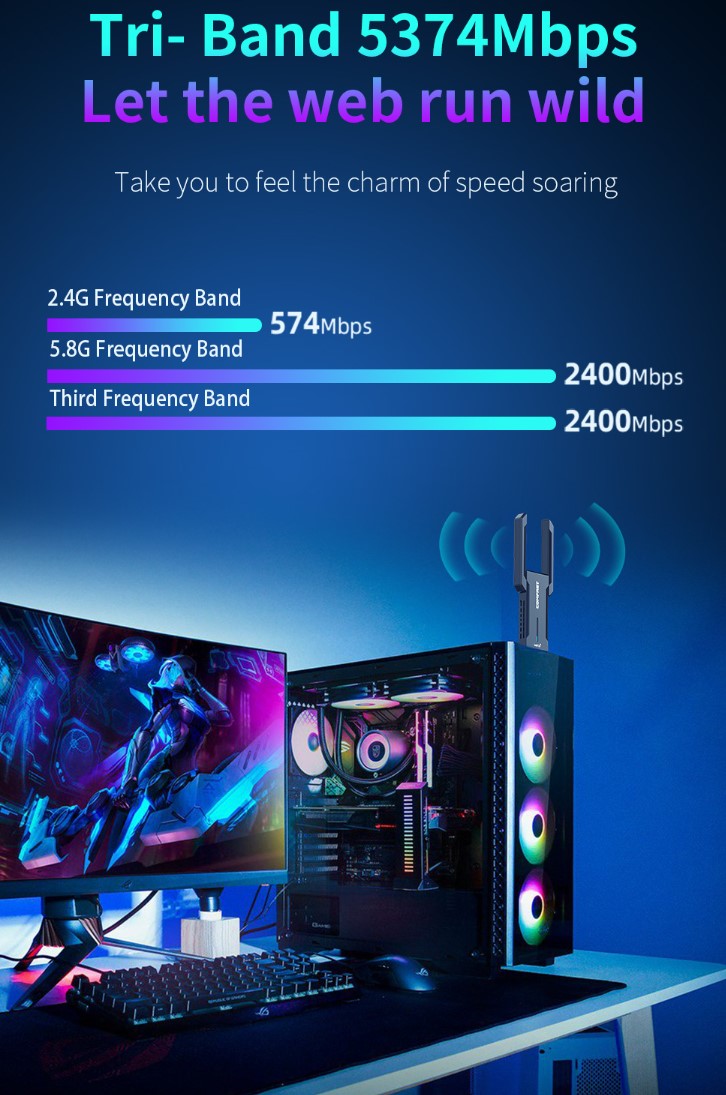 Najmodernejší Wi-Fi adaptér USB 3.0 podporujúci tri pásma, ktoré možno vyhľadávať súčasne - 2,4 GHz, 5 GHz a 6 GHz. Využitím 5GHz aj 6GHzz kanálov možno dosiahnuť vynikajúci výkon a zároveň znížiť rušenie. Technológia bezdrôtového prenosu 802.11AX. S týmto adaptérom si môžete užívať vysokú rýchlosť pri surfovaní, streamovaní alebo hraní hier na internete.